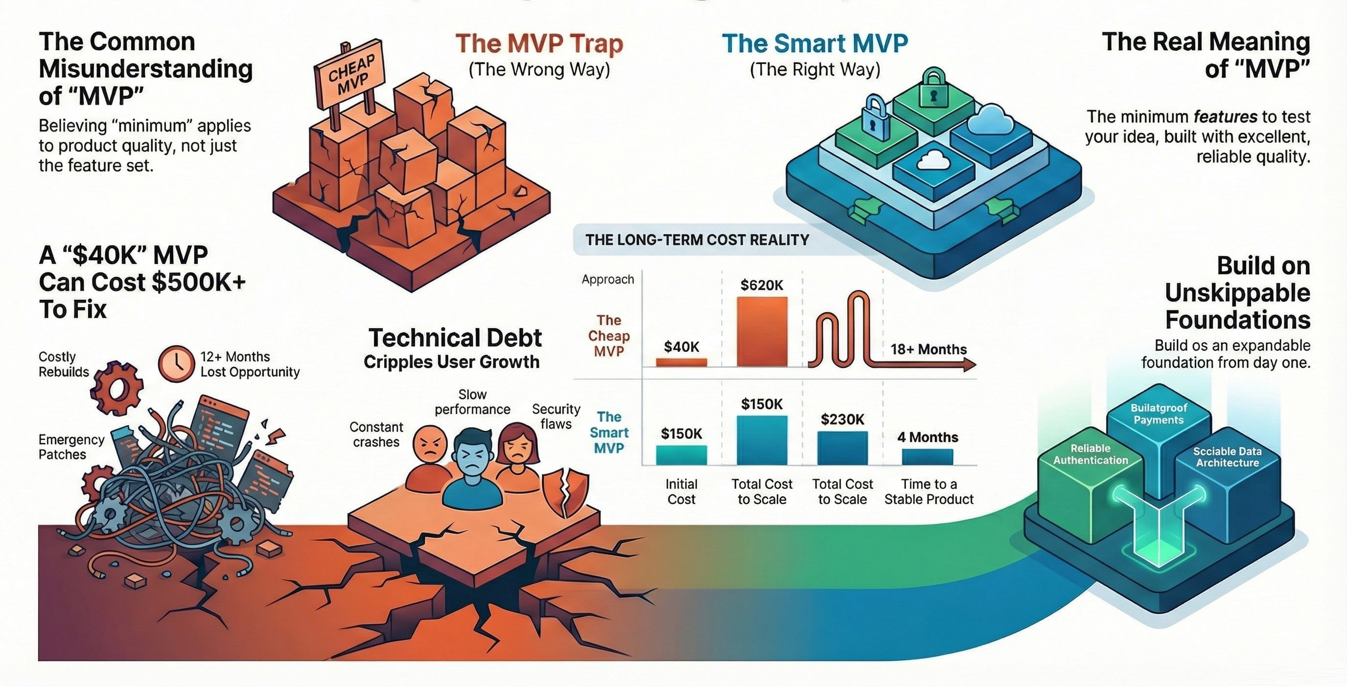 Total cost to fix the "cheap" MVP: $500K and 12 months of lost opportunity. Plus reputational damage that took years to overcome.